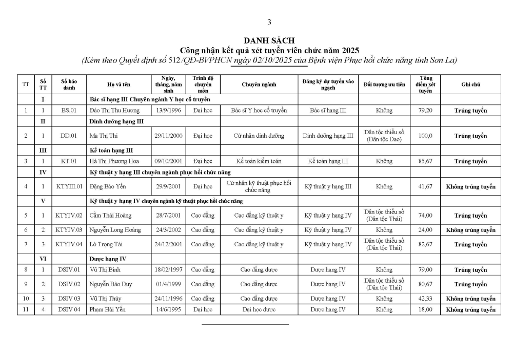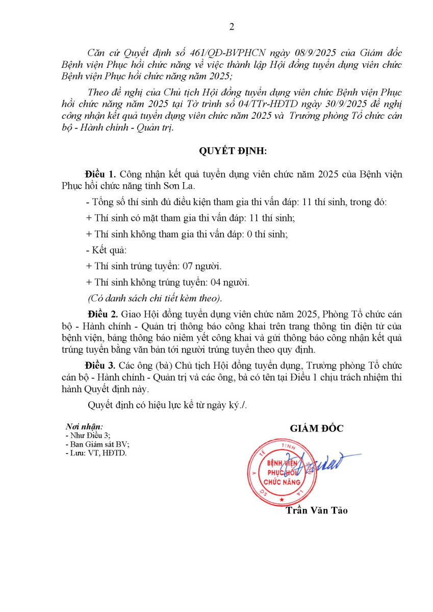 Thông báo Kết quả điểm thi Vòng 2 xét tuyển viên chức Bệnh viện Phục hồi chức năng năm 2025
