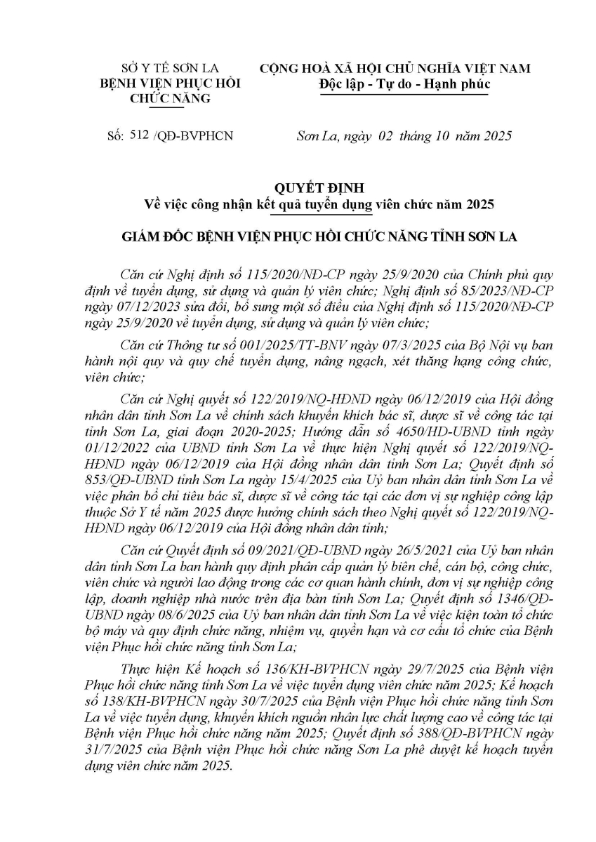 QUYẾT ĐỊNH Về việc công nhận kết quả tuyển dụng viên chức năm 2025